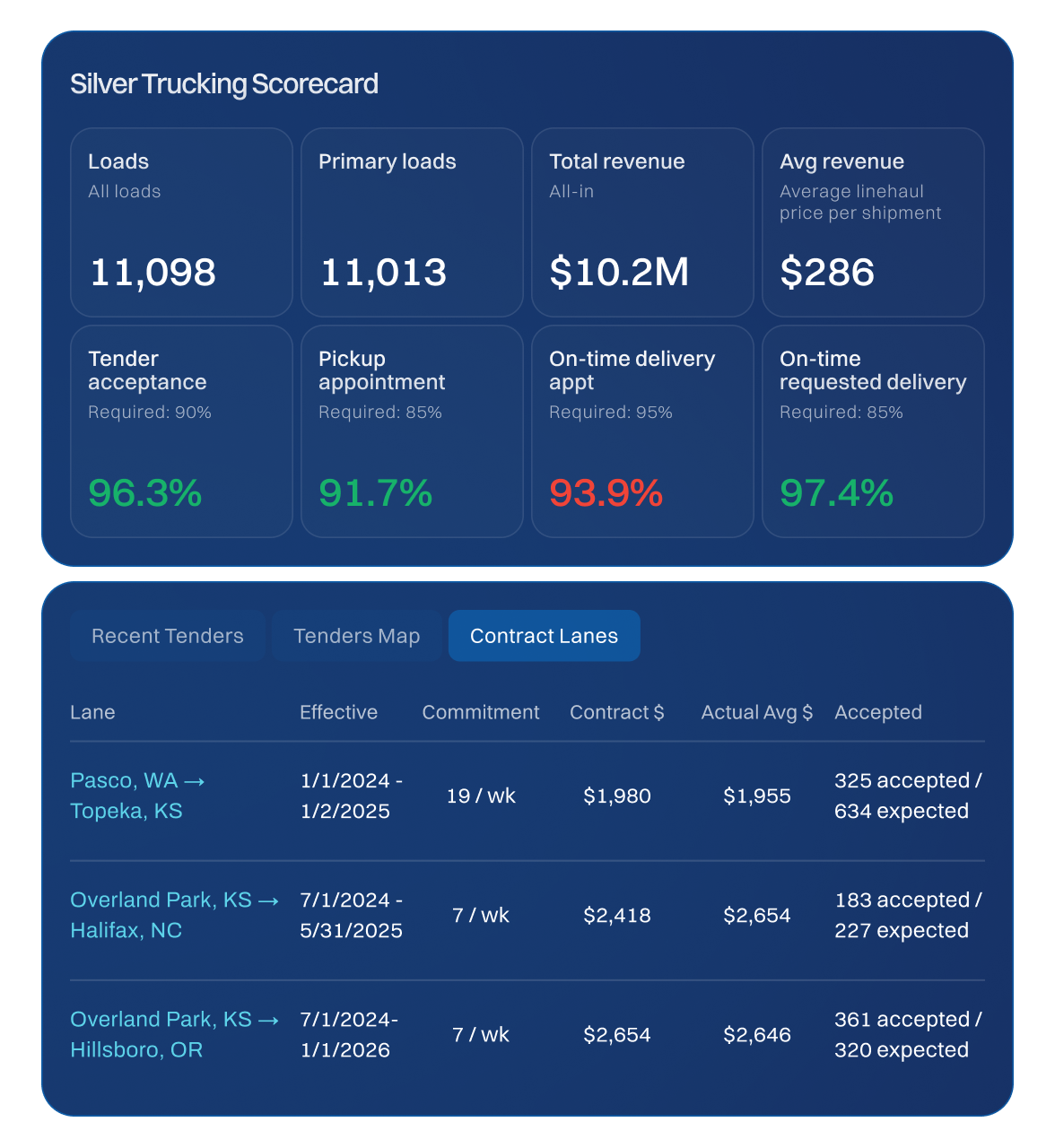 Instead of waiting for a weekly PDF or a quarterly service meeting, carriers can log into GoodShip at any time to see their current contracts, revenue to date, and where they stand on critical performance metrics like on time delivery (OTD), tender acceptance, and more.