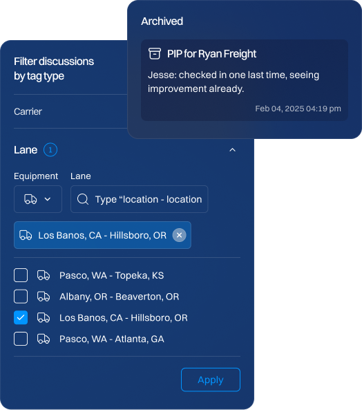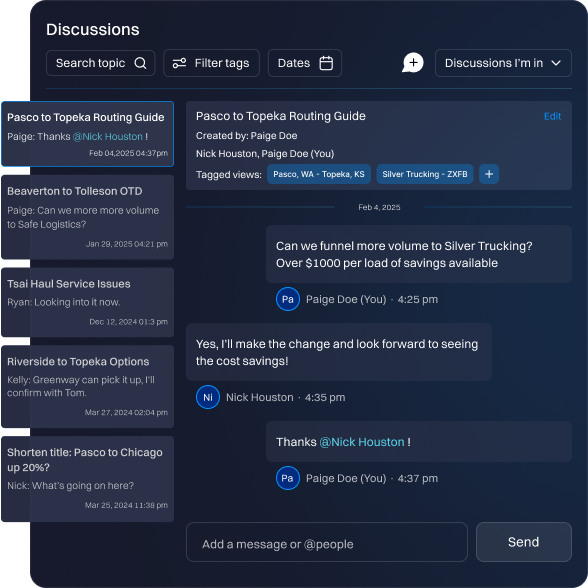 Tag teammates in messages and attach carrier and lane records directly to your conversations. Customize your notifications and step into and out of threads as needed to control your workflow.